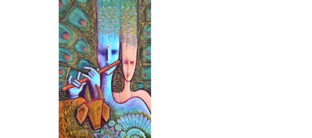 In works such as Radha Krishna & Peacock or Lord Krishna (Vol 5), the subjects are not merely mythological figures; they are conduits for universal emotions. His figures often possess a serene, meditative expression, with eyelids lowered in a state of samadhi (equanimity). This expression bridges the gap between the divine and the human, suggesting that the peace found in Krishna’s flute-playing is a tranquility accessible to all who seek it.
